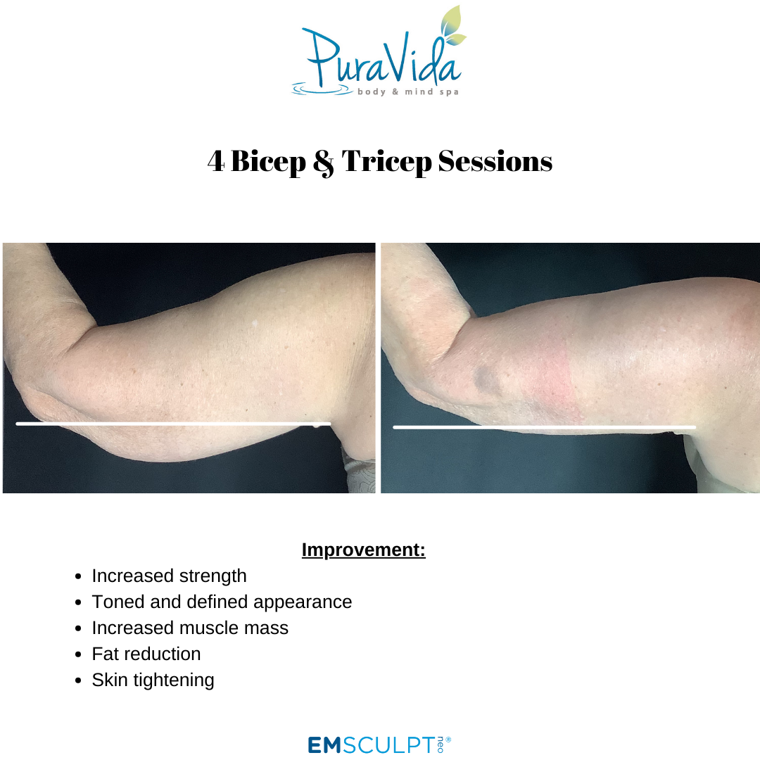 Emsculpt Neo treats the belly/abdominal area, butt, quads, inner or outer thighs, back of thighs, calves, and biceps/triceps. Love handle applicators are coming soon!